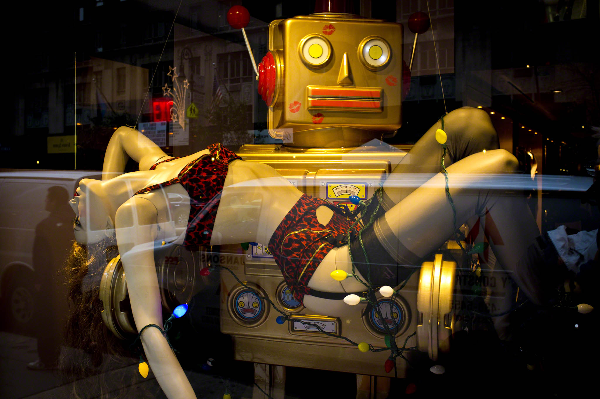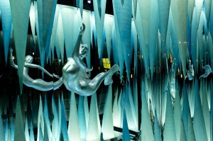 The dogs passed their interview with Mike the Trainer’s assistance (with him, they look trained as circus dogs!), and we made it out of town for Thanksgiving. The polite report was that when Zar barked (a barking frenzy, I have no doubt) he was “redirected.” The trainer says that the goal for the dogs is to be invited over to someone’s house with us for dinner, but so far they have no invitations. In New York City, Christmas had arrived before Thanksgiving. Conspicuous consumption was everywhere—check out Lady Gaga’s crystal cave window display at Barney’s. And the mannequin wrapped in Christmas lights? It reminds me of Kate in False Alarm shopping with the athletes—not enough places for them to spend their money.